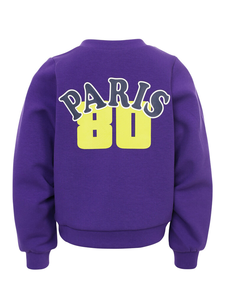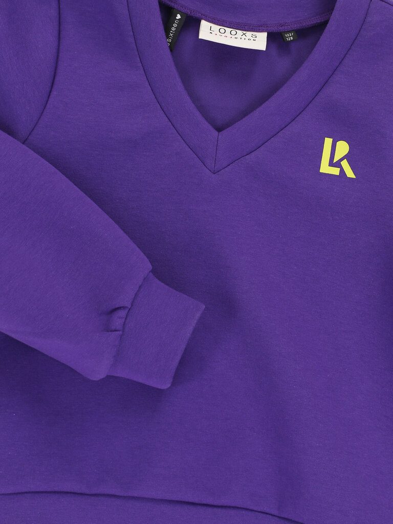 Solid purple sweater with a cool v-neck and a normal fit. Scuba sweat quality with a fancy print at the back. Sweater with long sleeves and a normal length. Cotton / Polyester / Elasthan.