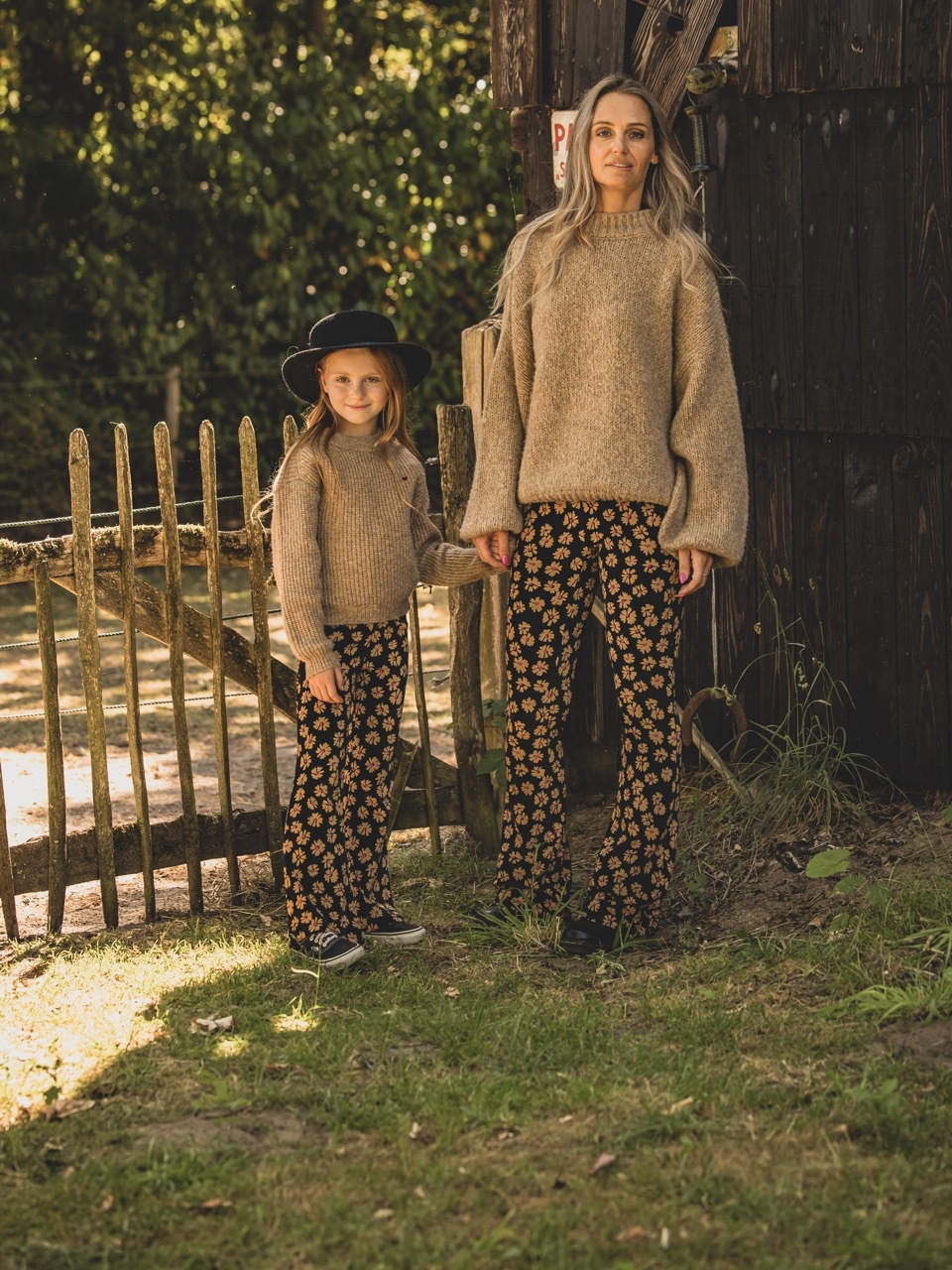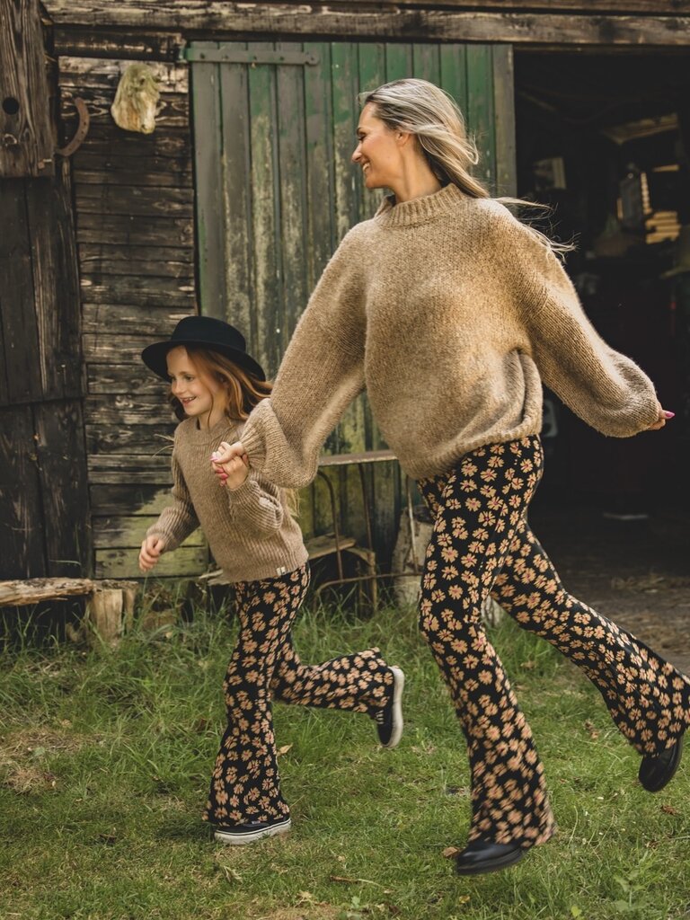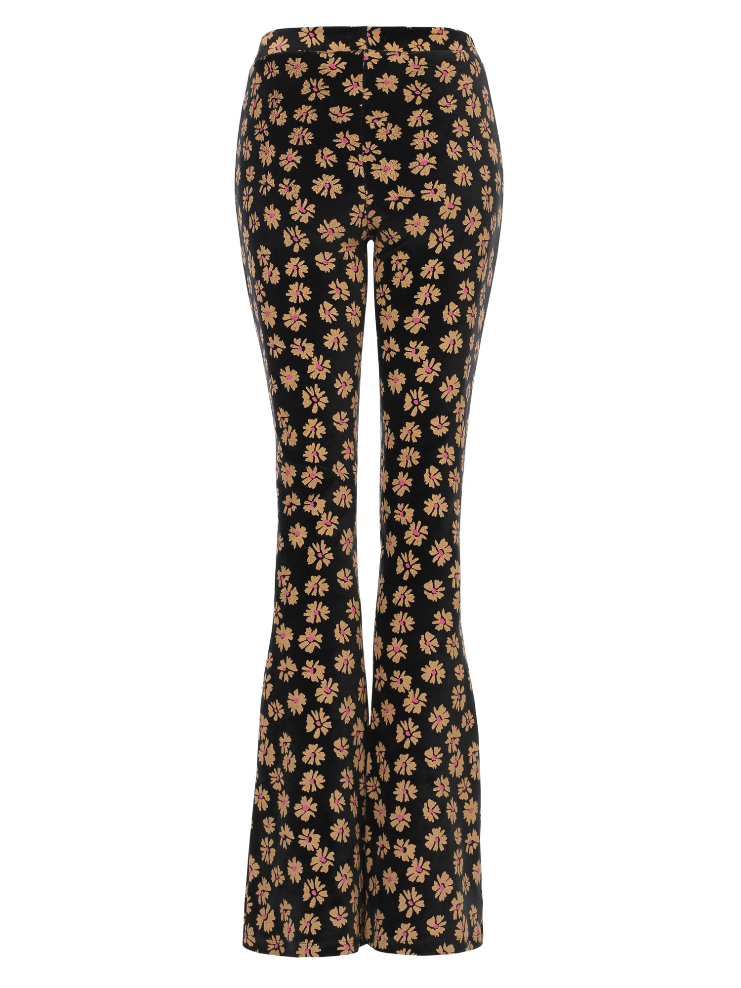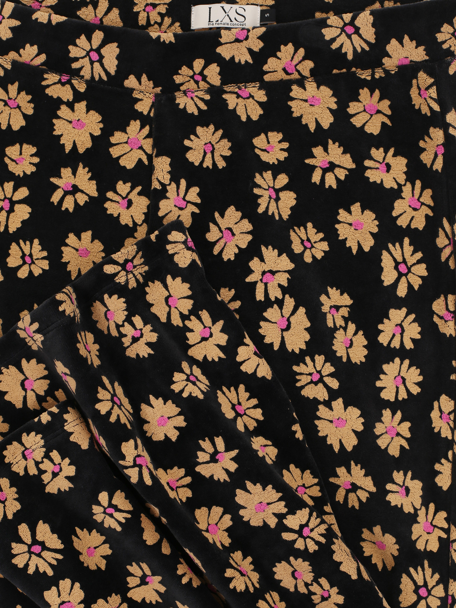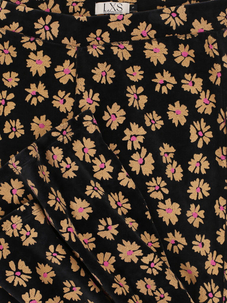 LXS Velvet flared pants Winter Flower Black Bestseller Alert this TWINNING ITEM! Solid black velvet pants with an all-over ochre flower dessin and a Fuchsia dot. Long length with flared fit. Elastic waistband.