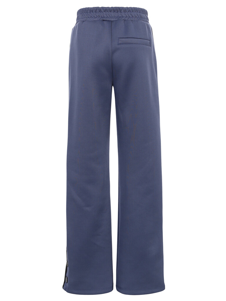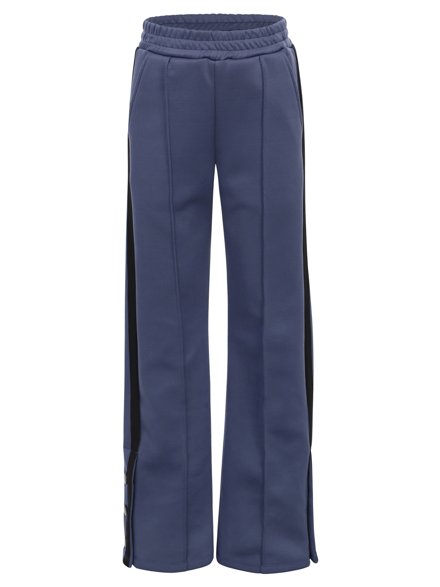 Sporty pants Stone Blue Cool loose fit shape Elastic waistband. White tapes on the side. Snap buttons to wear pants open at the bottum. Sporty sweat quality.