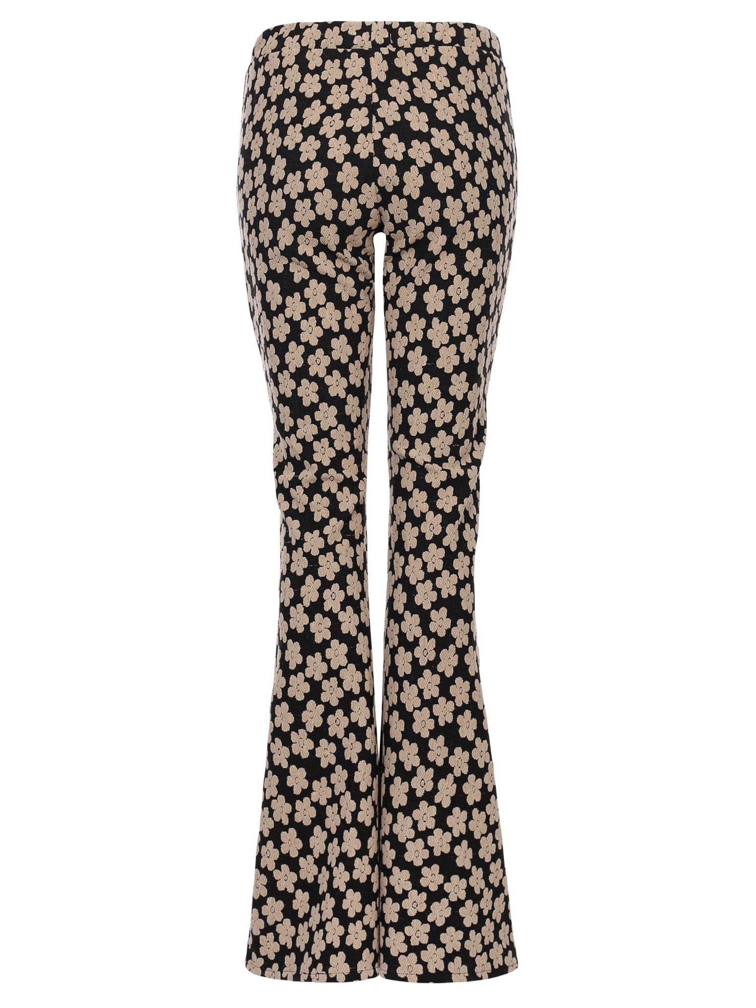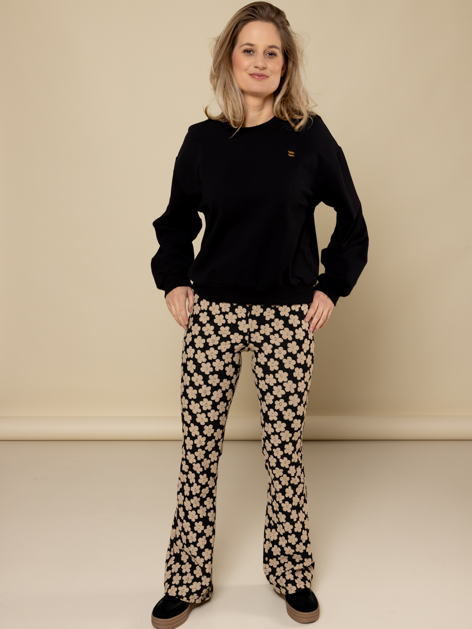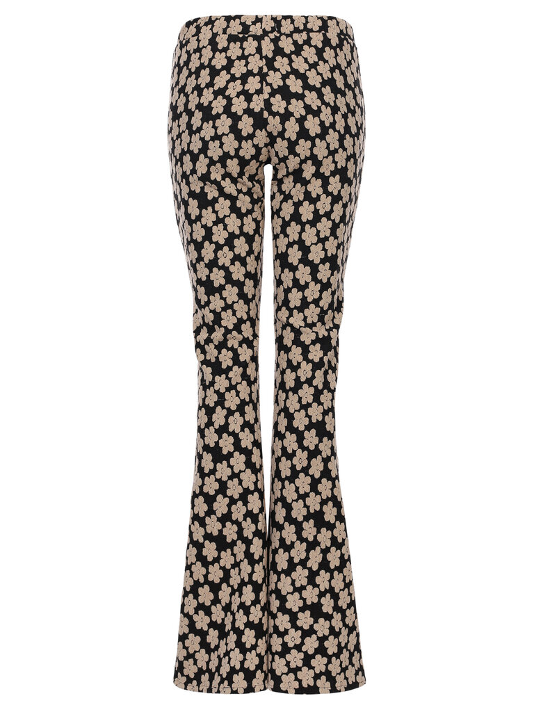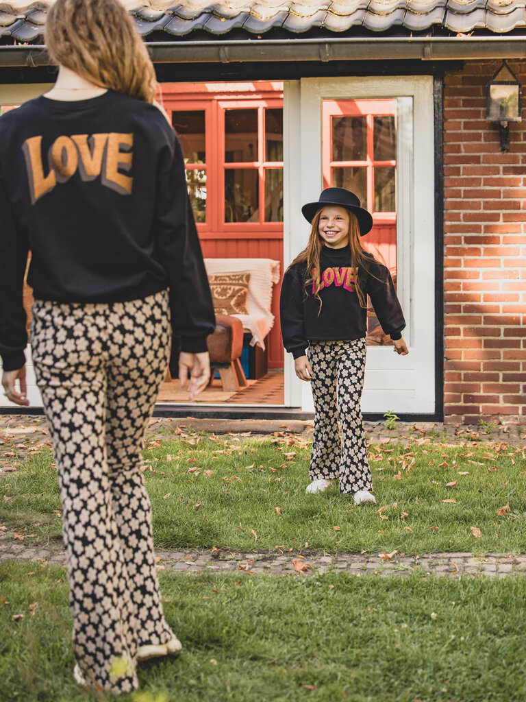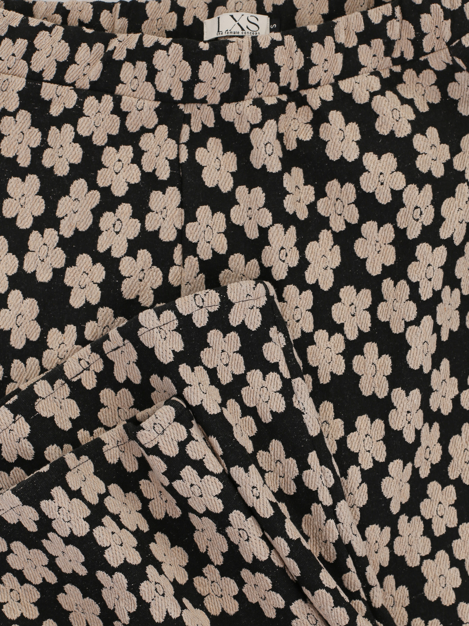 TWINNING ITEM! Casual, Cool & Comfy this flared pants with lots of stretch. Solid black color with offwhite intarsia flower dessin. A perfect match in this LOOXS little drop 3. Long length with a flared fit. Elastic waistband.