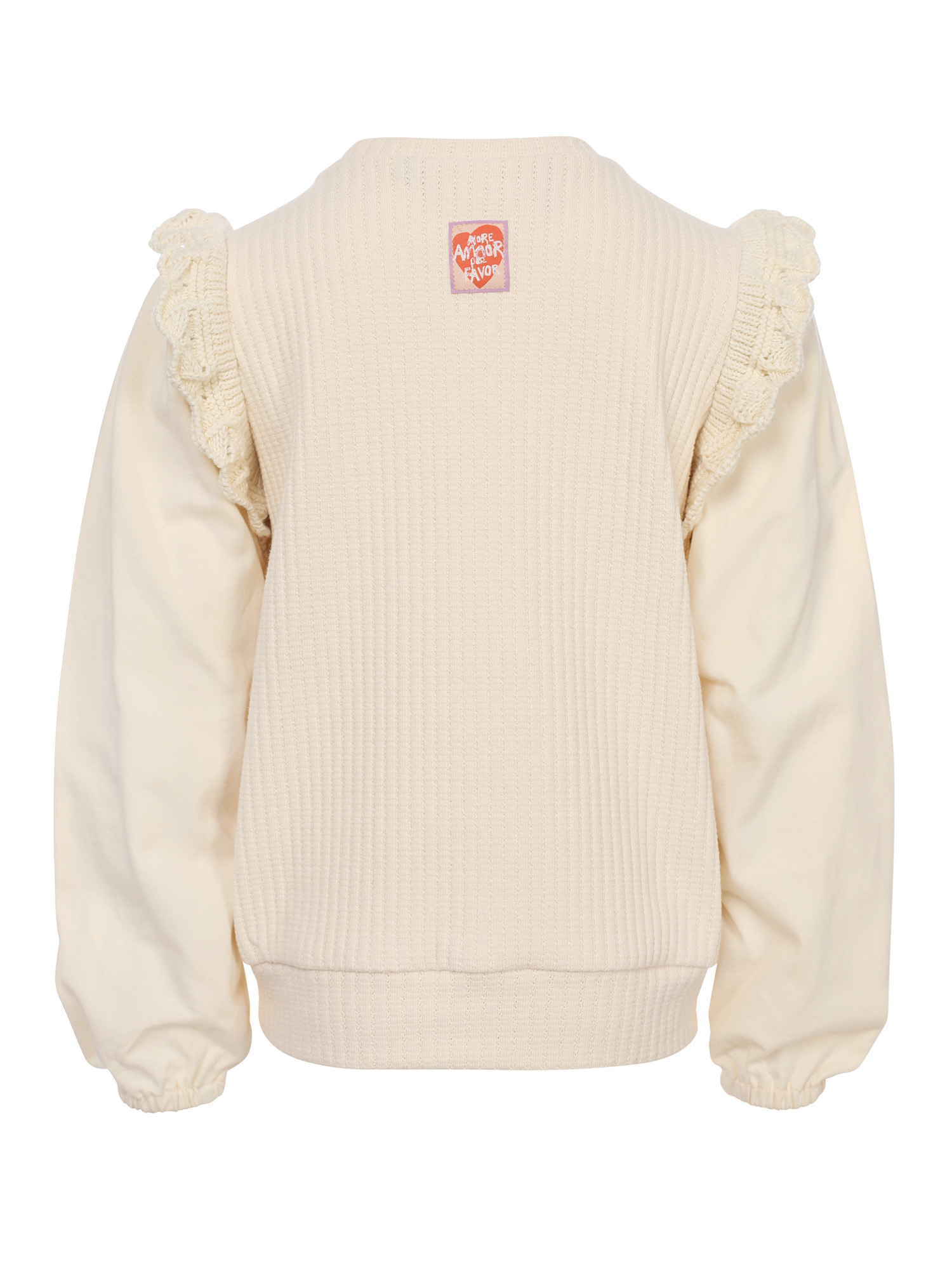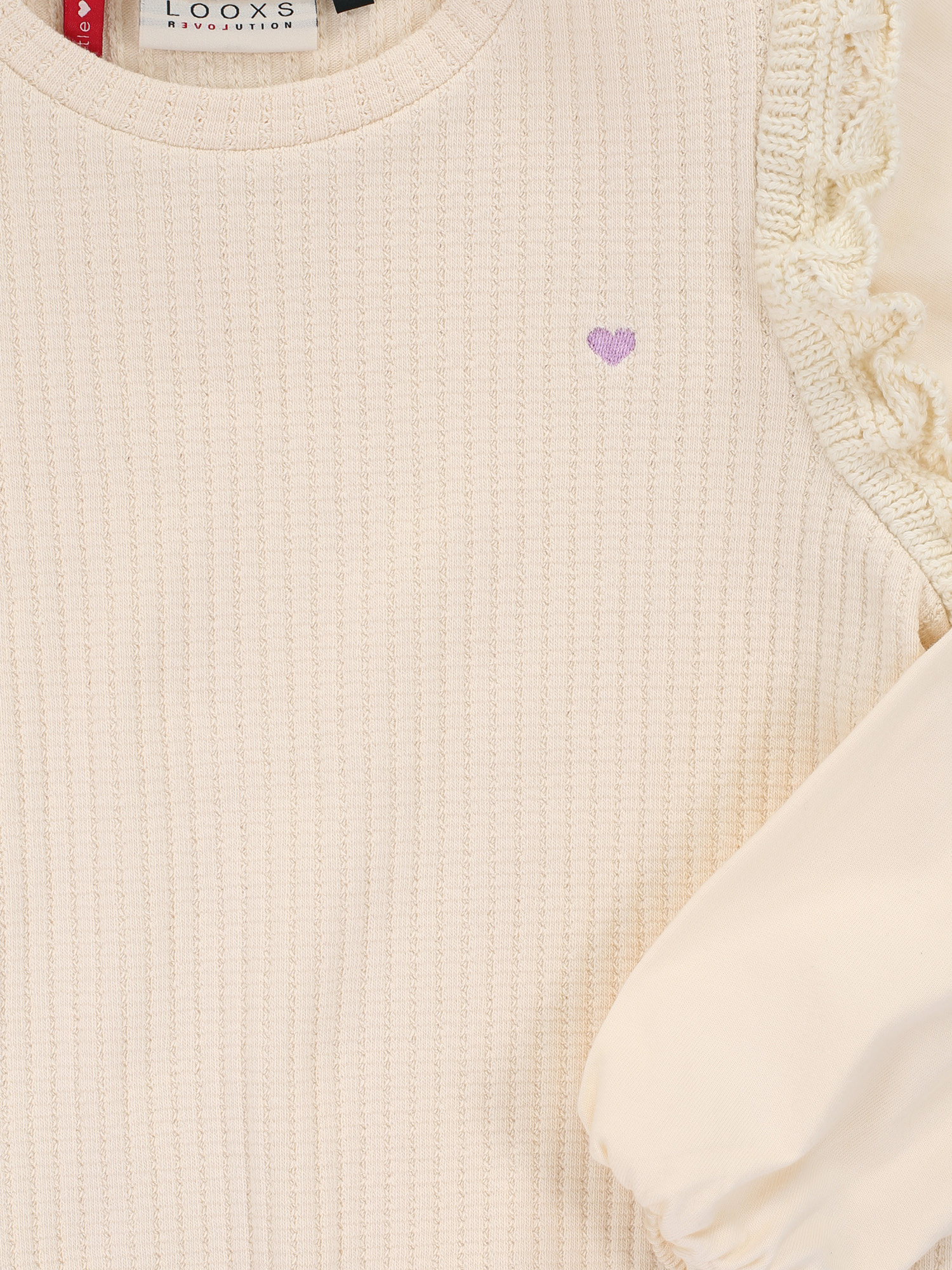 Dieses Top ist super schick mit einem gestrickten Oberteil aus Jersey, weiten Puffärmeln und einer kleinen Rüsche. Das Top ist wunderbar weich und hat eine bequeme, lockere Passform. Gesticktes Herz auf der Brust.