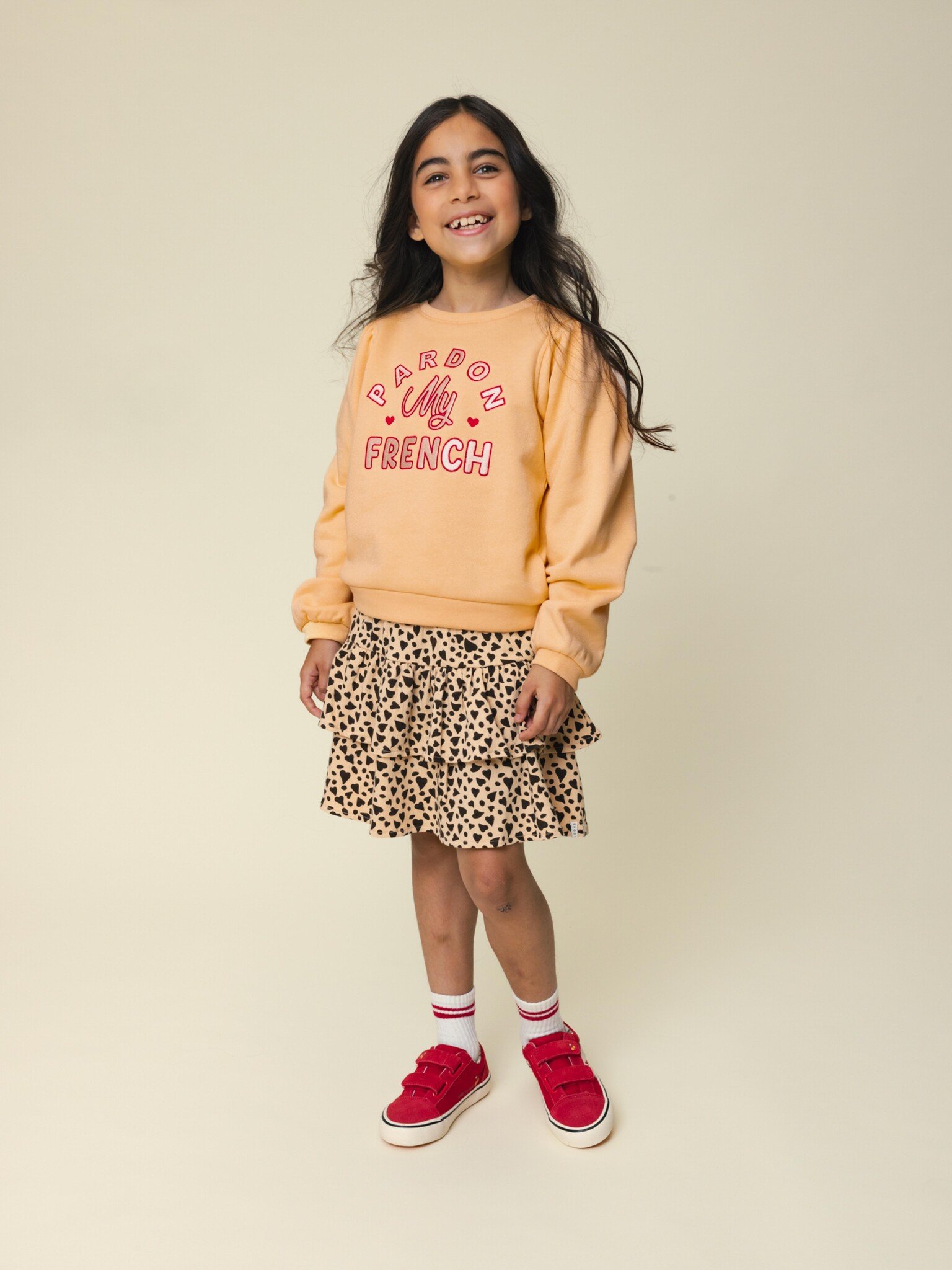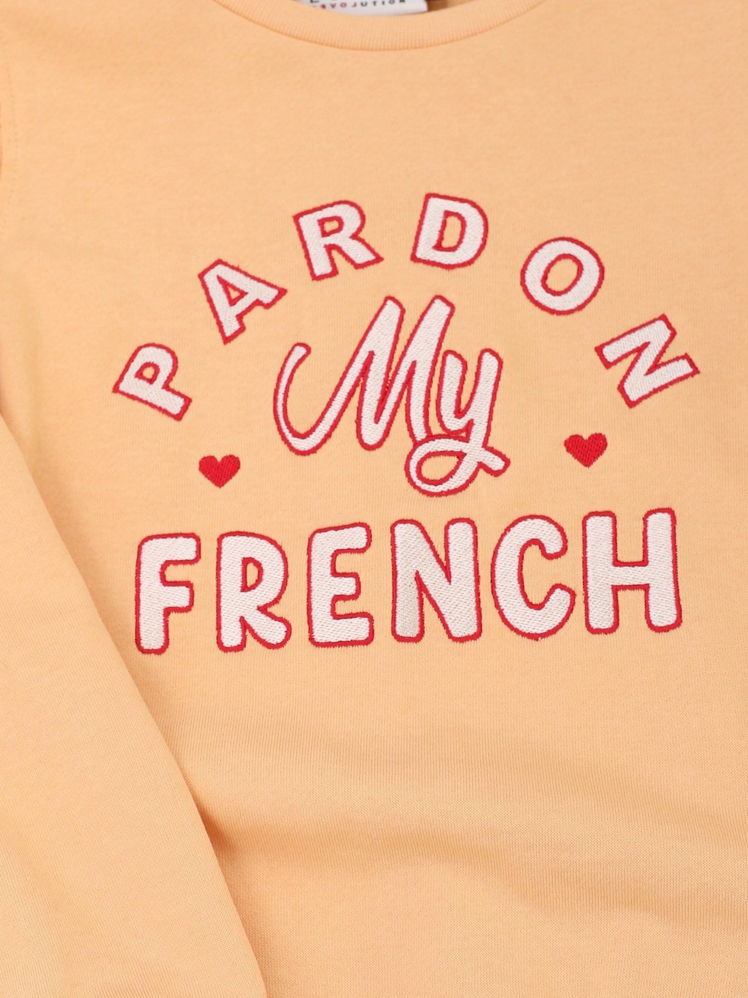 "Pardon my French" Stickerei. Wunderbar bequemer, leichter Baumwolljersey, perfekt für den Sommer. Weiß-rote Textstickerei auf der Vorderseite. Normale Passform. Normale Länge.