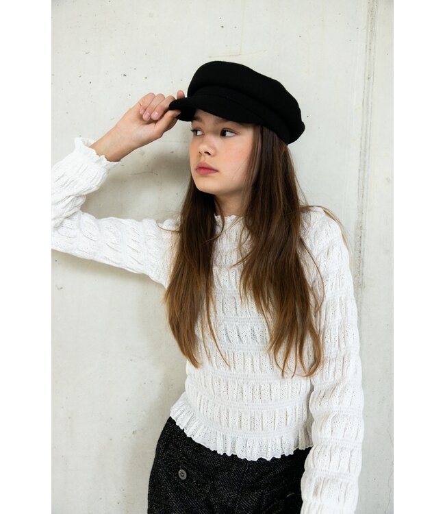 Super Nice this lace top with a fancy balloon-effect by the stitching. Beautiful winter snow white color, which of course is perfect for a party or just go to school wearing it. A little shorter fit that nicely falls on the waistband.
