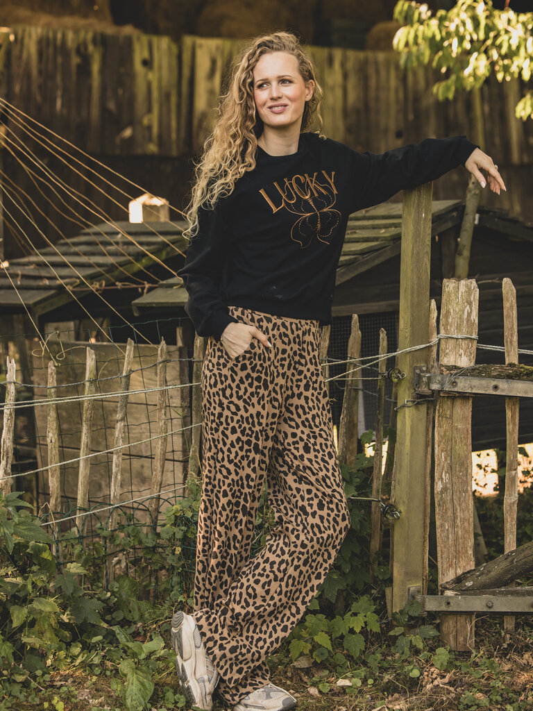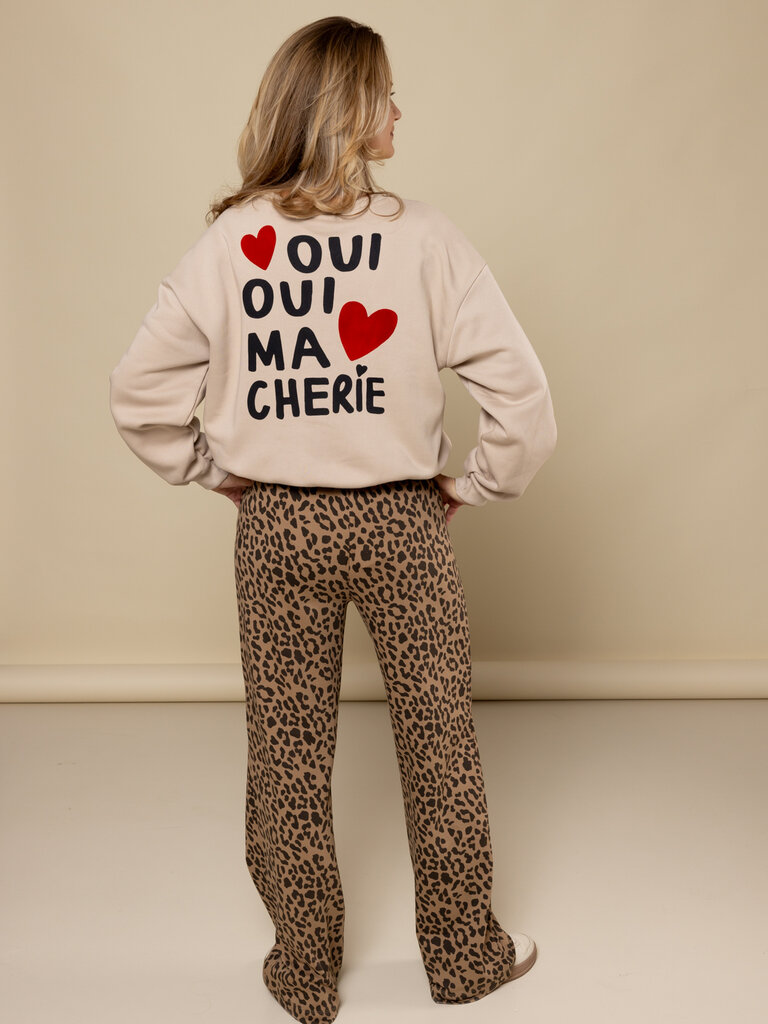 Let's go wild in this sweat pants. Uni sand color with an all over dessin. Fancy cotton sweat fabric. Elastic waistband. Loose fit. Normal / Long length.