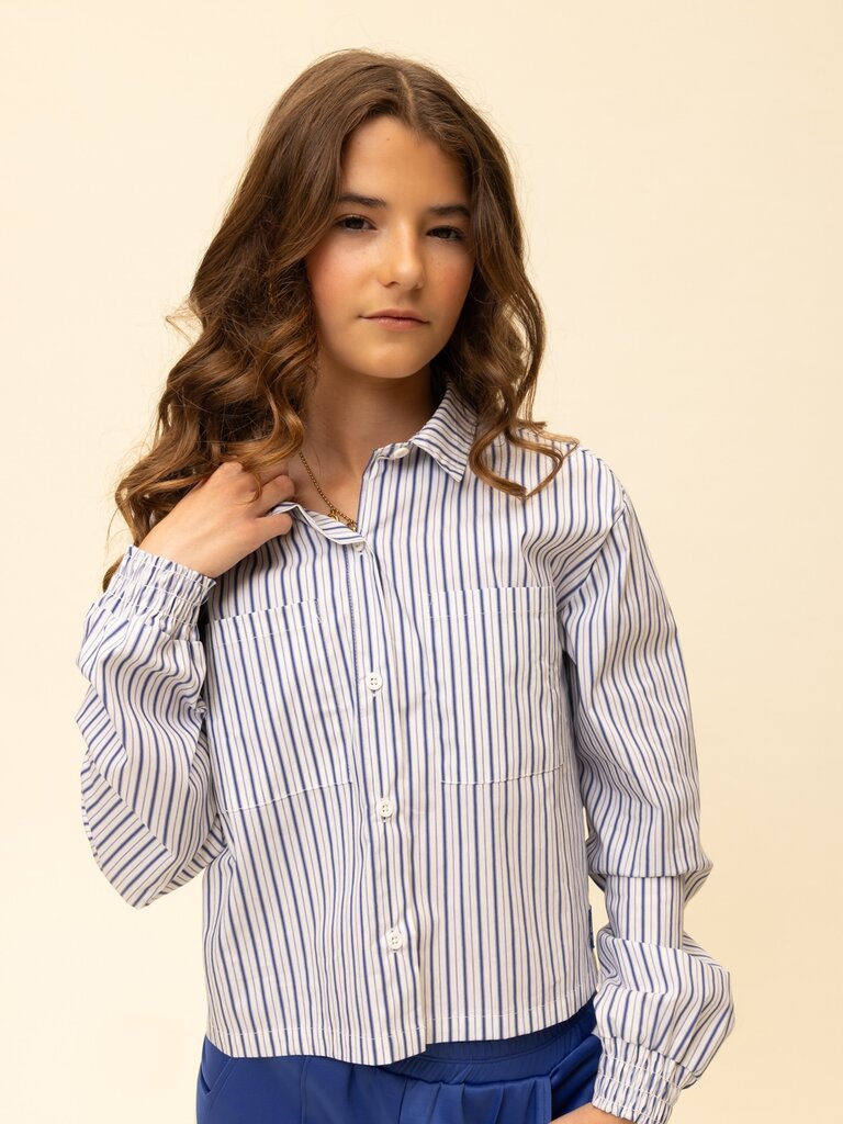 Blouse Striped Kobalt Cool and little cropped fit. Elastic in sleeves for puffy effect. Fancy stripe dessin. 100% Cotton.