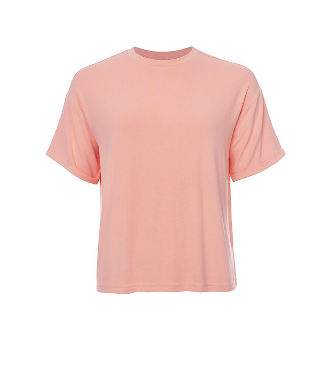 Heerlijk loose-fit t-shirt in een wat zwaardere viscose kwaliteit. Mooie afgezwakte koraal kleur. Boxy fit. Combineert leuk op het bloemen shortje of de flared paisley broek.