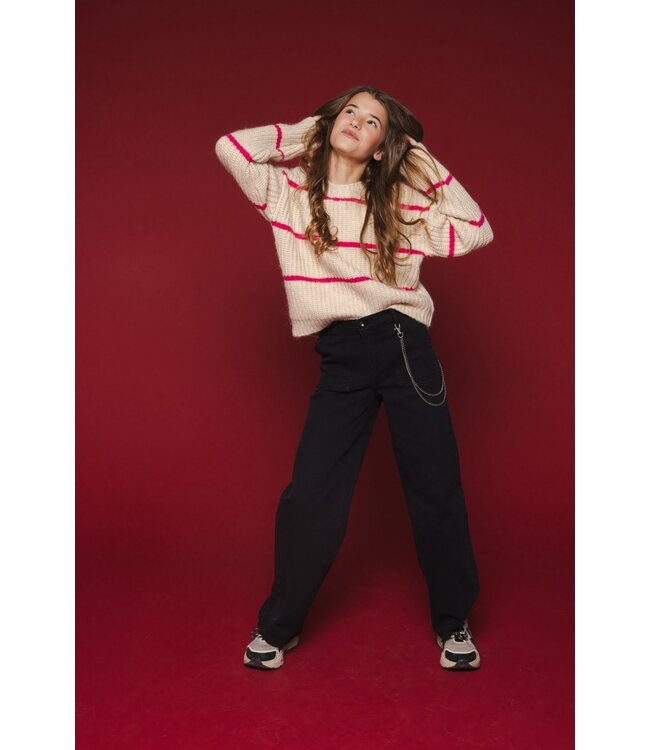 Cool denim broekje met een stylisch recht pijpje en een ketting die er los bij geleverd wordt.