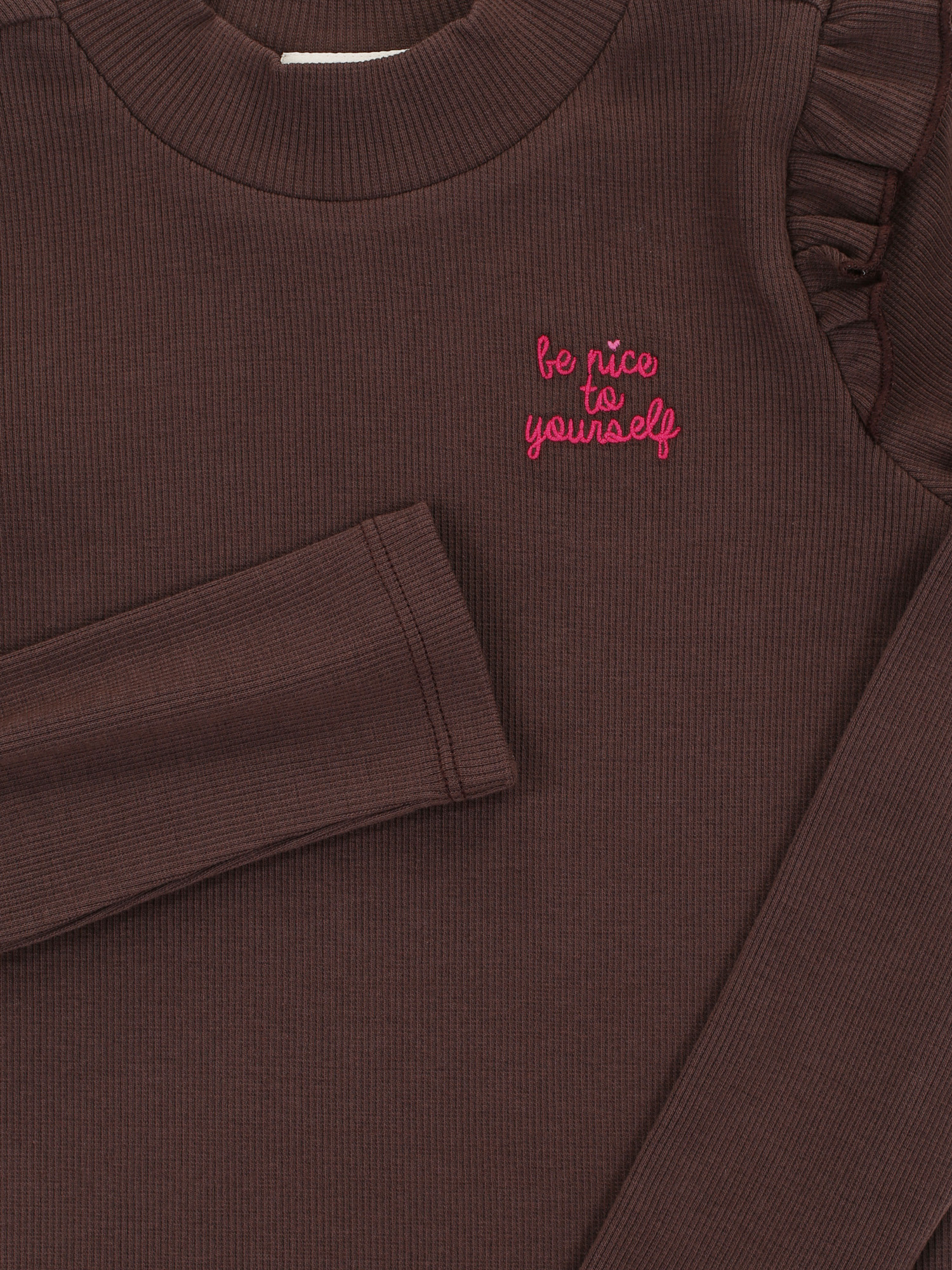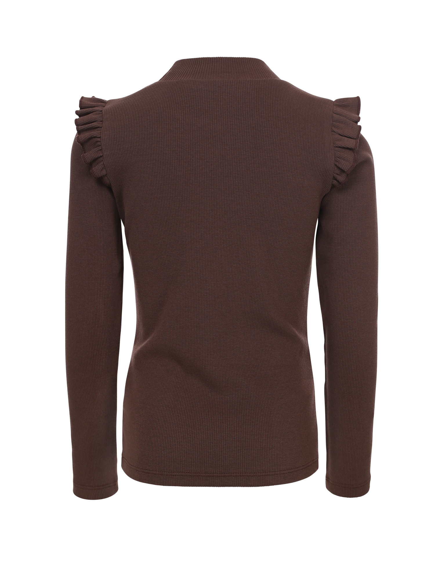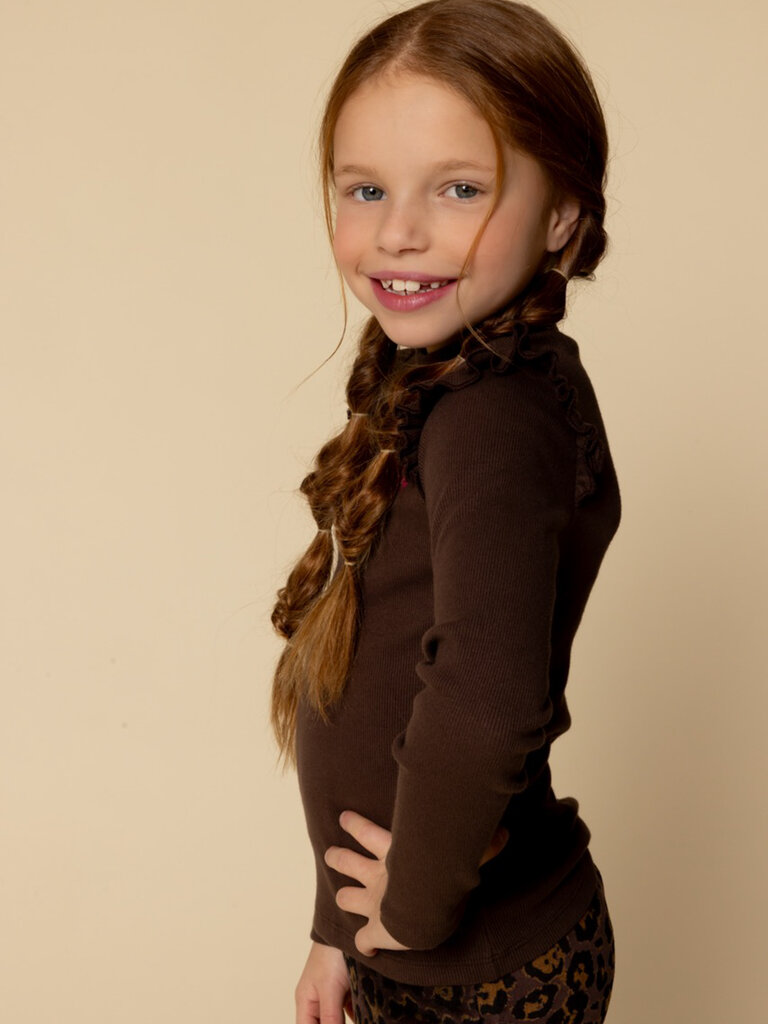 Mooi t-shirt in een wat zwaardere rib jersey kwaliteit, perfect voor in het najaar en de winter. Uni bruine basis kleur die perfect matcht in deze eerste drop van Looxs Little. Slim fit tot normal fit en een comfy lange lengte. Ruffle op de schouders.