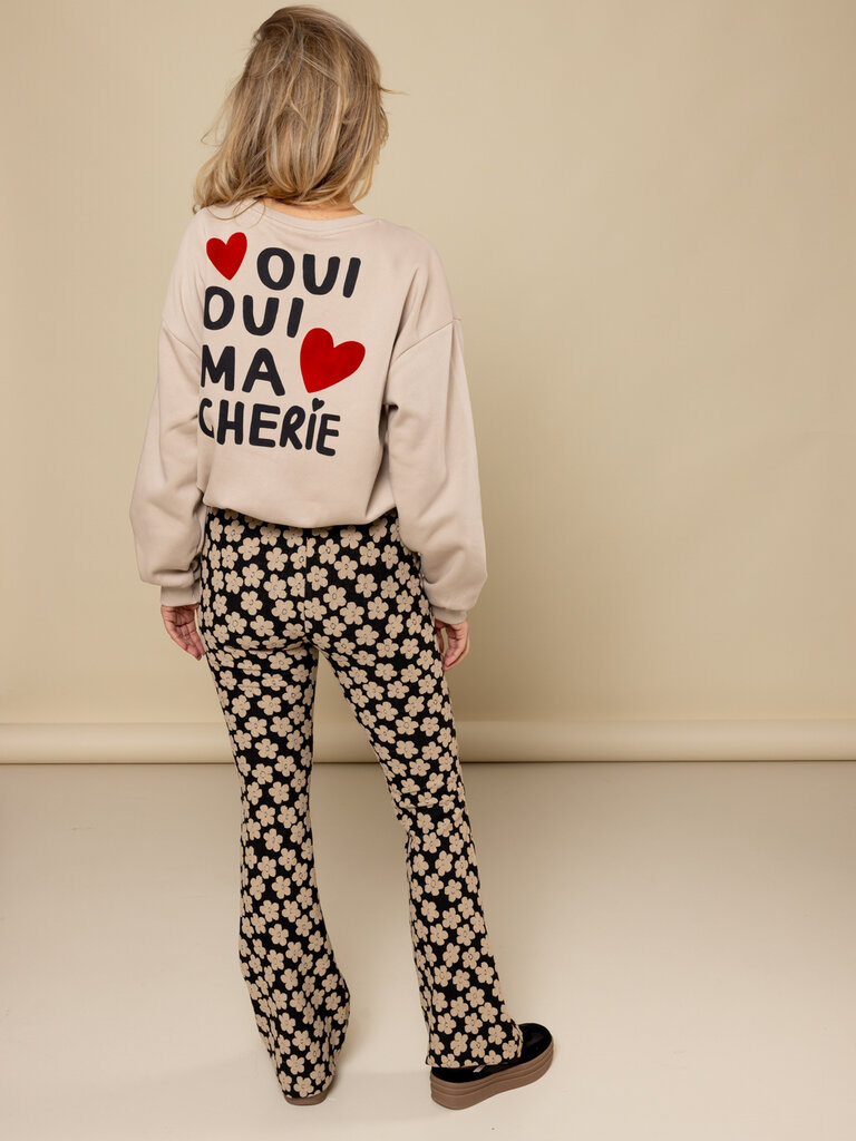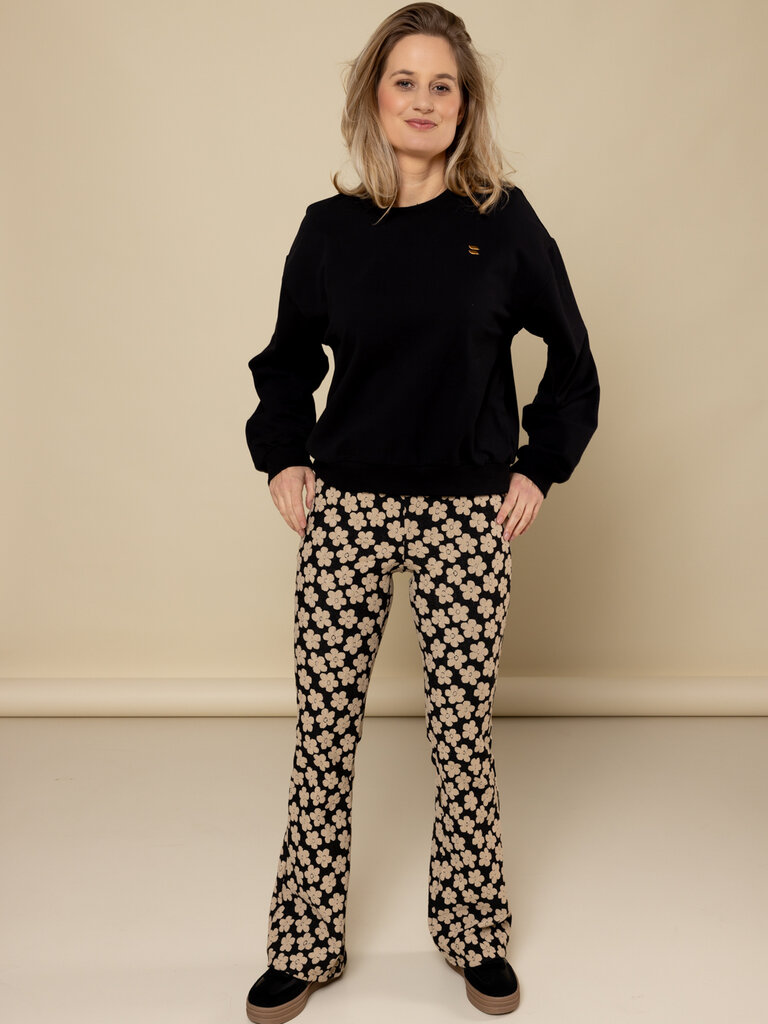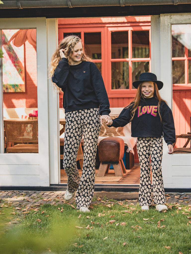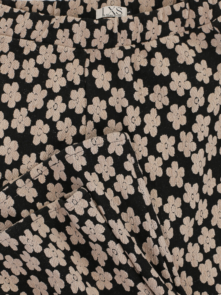 TWINNING ITEM! Casual, Cool & Comfy. Uni zwarte ondergrond kleur met beige intarsia bloem dessin. Een perfecte match met LOOXS little drop 3. Lange lengte met een flared fit. Elastische tailleband.