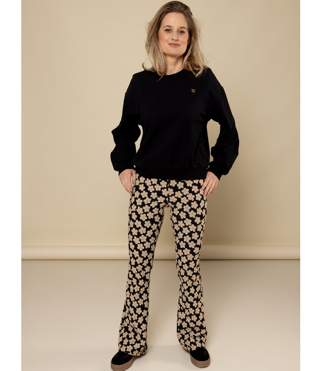 Uni zwarte ondergrond kleur met beige intarsia bloem dessin.