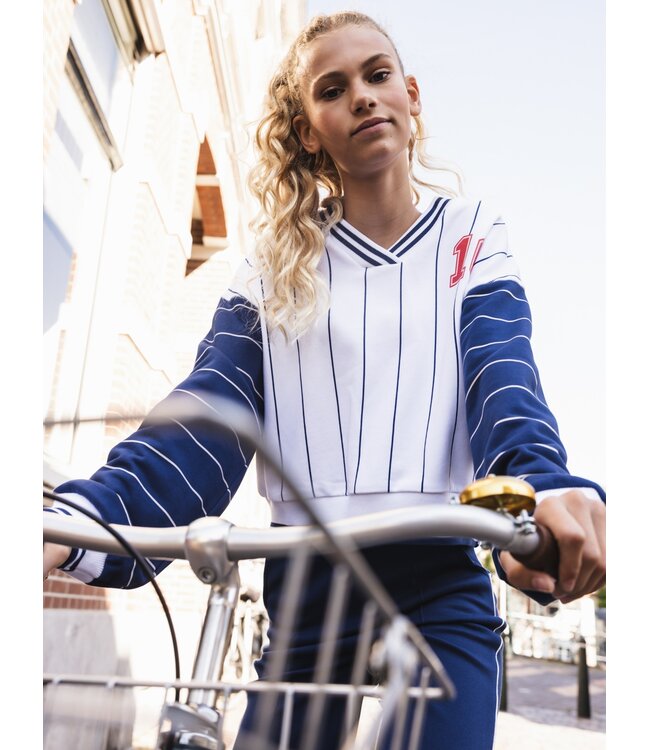Uber cool deze oversized katoenen sweater met een v-hals. Wit - navy combi color block. Leuke rode tekst print op de rug en borst. Lees meer.