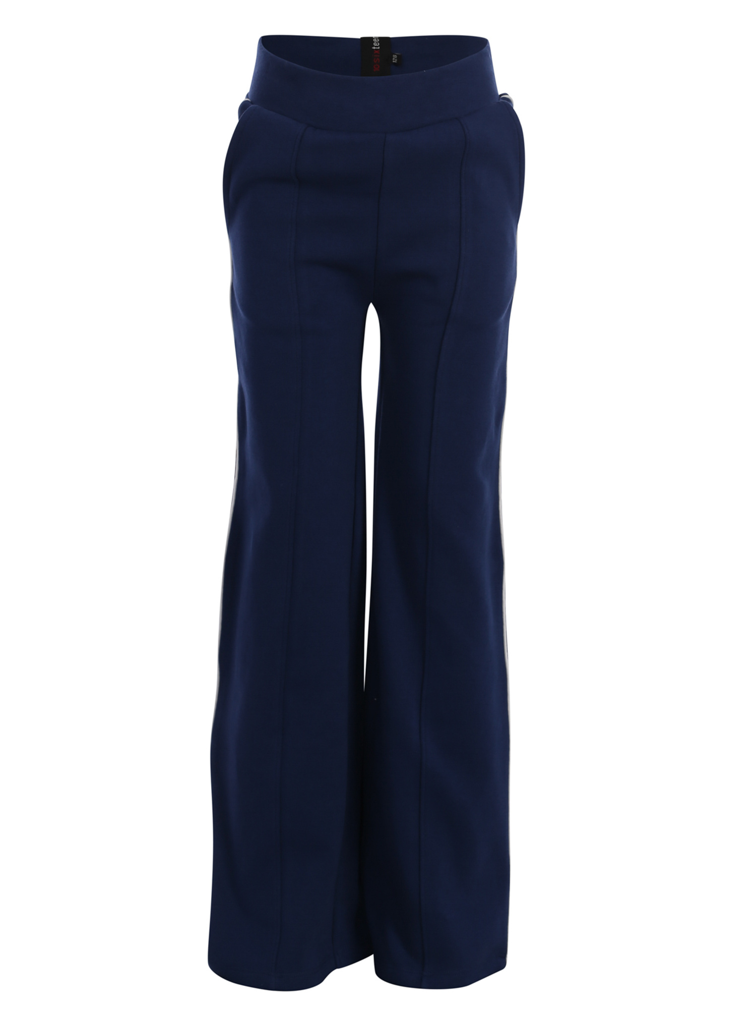 The perfect Navy straight leg pants! Heerlijk comfy door de katoenen interlock kwaliteit. Elastische tailleband. Naadje op het been en een coole witte piping voor een sporty look. Lange lengte.